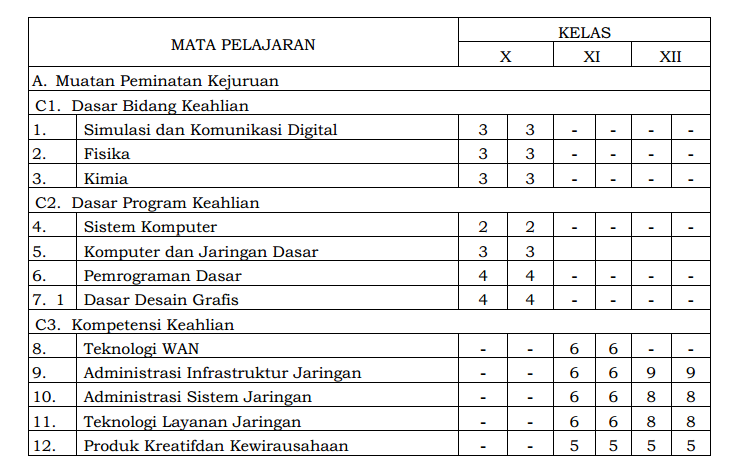 Ada 12 materi TKJ yang akan diajarkan dalam tingkatan 3 tahun (kalas 10, 11, dan 12). Masing - masing tingkatan kelas mempunyai materi yang berbeda - beda. Tapi untuk yang kelas 11 dan kelas 12, ada beberapa silabus yang secara kebetulan mempunyai kesamaan tapi ada kemungkinan dalam pengaplikasiannya berbeda, itu tergantung ibu/bapak guru pengajar.Gambar di atas berasal dari file struktur kurikulum TIK yang akan saya bagikan juga di bawah. Untuk penjelasannya mengapa saya taruh gambar tersebut adalah untuk memberikan pernyataan mengenai 4 kesamaan materi pelajaran (silabus) yang akan digunakan oleh kelas 11 dan 12.